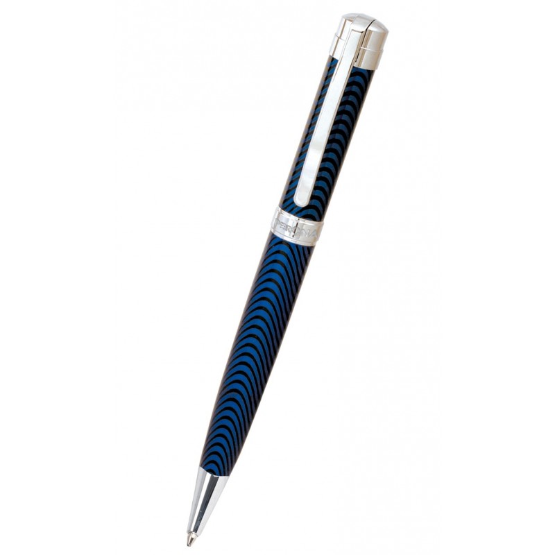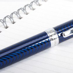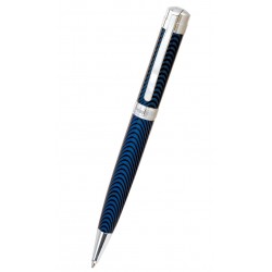 Incluye: Set de regalo con 1 bolígrafo con depósito y capuchón de color azul en ondas, clip, capuchón giratorio que regula el avance de la mina y logotipo de marca grabado en la parte central y 1 caja estuche para el bolígrafo acolchada en el exterior y forrada en el interior con logotipo de color plateado.