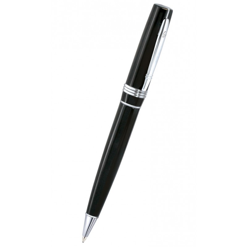 Incluye: Set de regalo con 1 bolígrafo con depósito y capuchón de color negro, clip, capuchón giratorio que regula el avance de la mina y logotipo de marca grabado en la parte superior del clip y 1 caja estuche para el bolígrafo acolchada en el exterior y forrada en el interior con logotipo de color plateado.