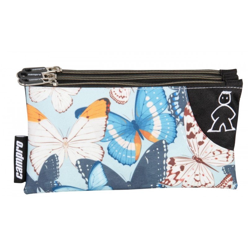 Incluye: 1 portatodo de color azul y negro diseño especial de mariposas a todo color, logo bordado, tres espacios separados con cierre de cremallera, cursores personalizados y cremallera de alta calidad, tirador en cursor que facilita su apertura, forro interior de protección y materiales de fabricación de gran resistencia y ligereza.