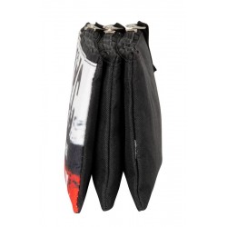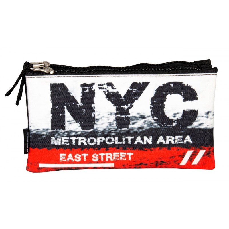 Incluye: 1 portatodo triple de color negro, blanco y rojo con diseño NYC, tres compartimentos separados por cremalleras, tirador en cursor y forro interior.