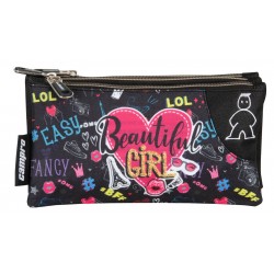 Incluye: 1 portatodo escolar triple de color negro con diseño Beautiful Girl con corazón y más detalles a color, logo bordado, tres espacios separados con cierre de cremallera, tirador en cursor y forro interior de protección.