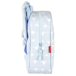 Include: 1 zaino blu con disegno speciale di giraffa su sfondo di cuori bianchi, scomparto principale con chiusura a zip e tiretto in tessuto, fodera interna, tasca laterale per bottiglia in rete, spallacci imbottiti regolabili, tracolla imbottita, maniglia superiore per il trasporto e carta d'identità personale.